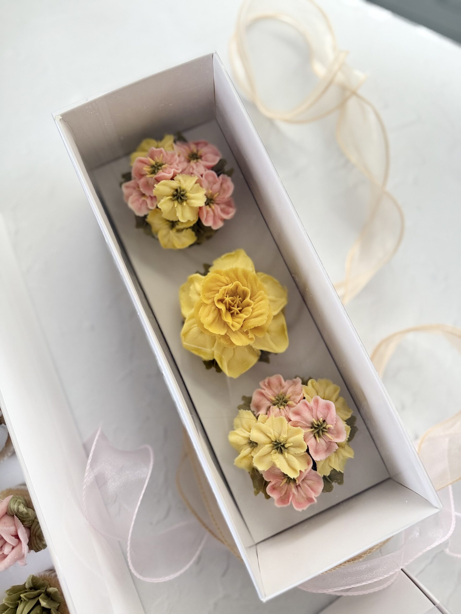 A 3-hole specialty floral cupcake box designed by Bouquet Cakes specifically with wider spacing to accommodate your designs. All showcased with a stunning clear lid to show off your gorgeous cakes.