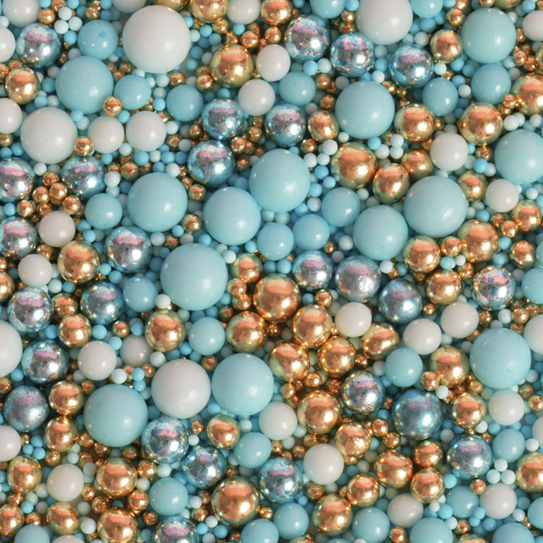 Elevate your bakes with a luxurious sprinkle blend designed to add instant sophistication to any creation. This dazzling mix features shimmering gold and metallic blue dragees with soft matte aqua and crisp white tones, delivering a modern, elegant palette that shines beautifully on cakes, cupcakes, cookies, and more.