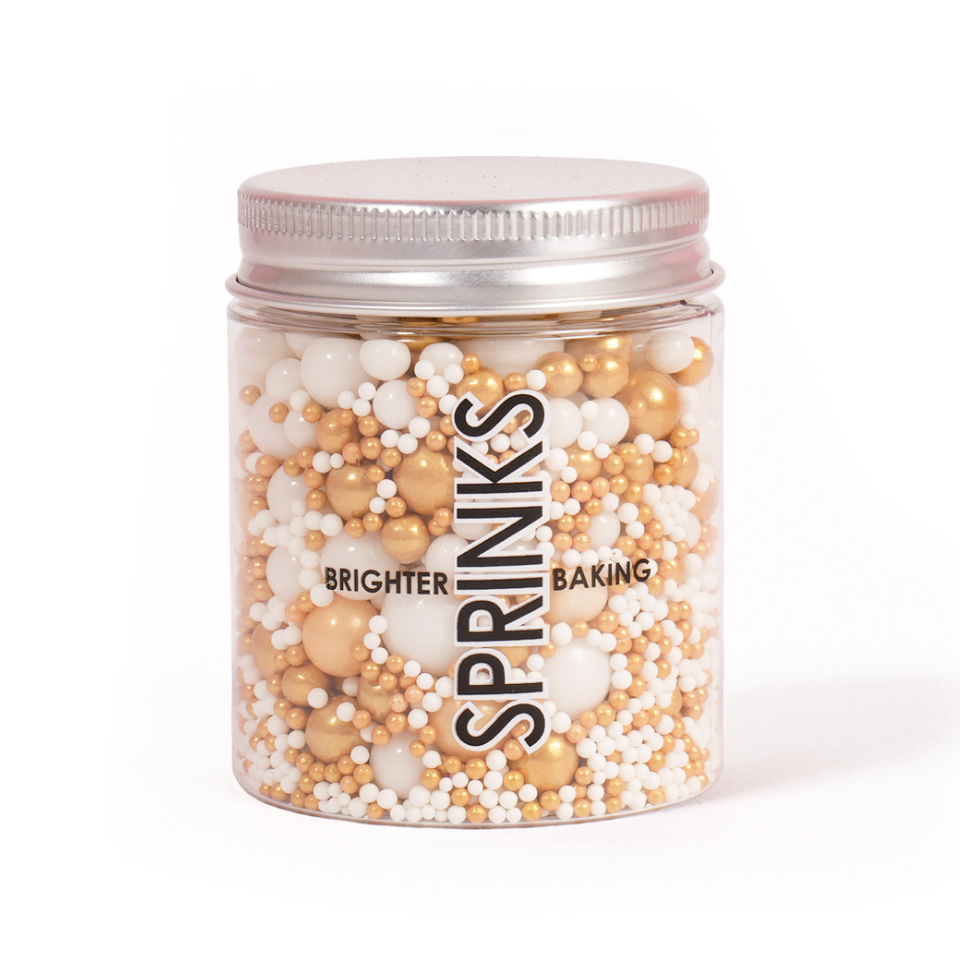 Elevate your bakes with a luxurious sprinkle blend designed to add instant sophistication to any creation. This dazzling mix features shimmering gold and beige dragees paired with soft matte neutrals and crisp white accents, delivering a modern, elegant palette that shines beautifully on cakes, cupcakes, cookies, and more.