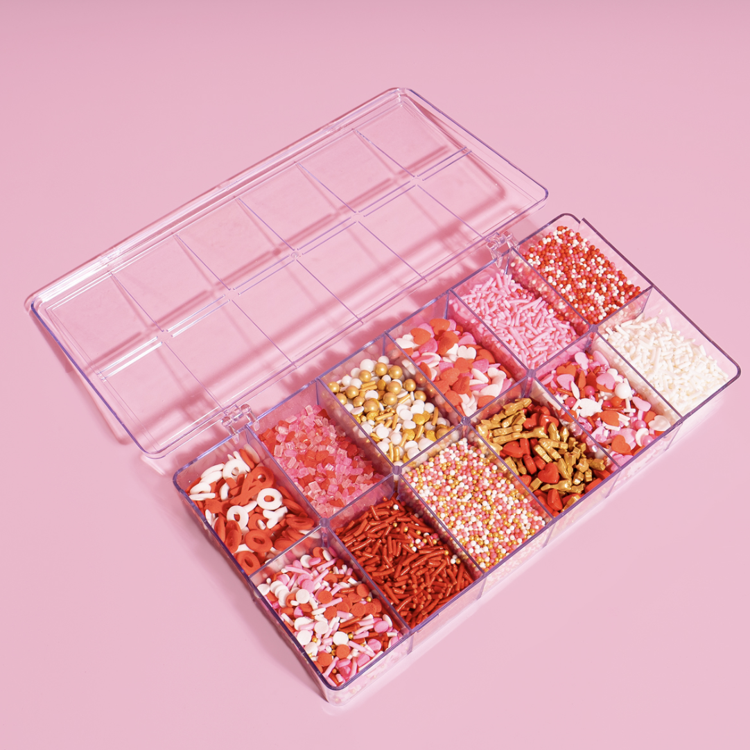 Fall head over heels for the sweetest sprinkle collection of the season. Twelve beautifully curated compartments filled with red, pink, white, and gold sprinkles—perfect for creating romantic bakes, heartfelt cupcakes, and show-stopping celebration cakes.